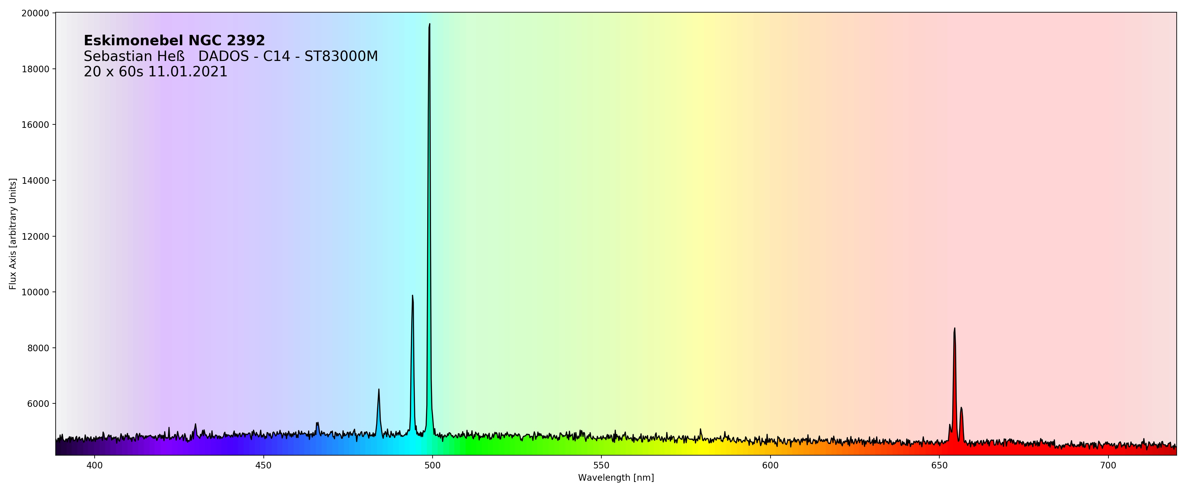Ganz besonders deutlich werden die Linien des zweifach ionisierten Sauerstoffs und des einfach ionisierten Stickstoffs im eindimensionalen Spektrum sichtbar. Hier das eindimensionale Spektrum des Eskimonebels NGC 2392