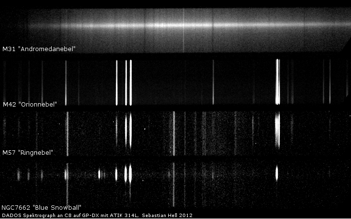 Auch weitere, dunkle Himmelsobjekte offenbaren ihre Natur unter Verwendung eines Spektrographen. Auf dieser im Juni 2011 begonnenen und im Januar 2012 komplettierten Zusammenstellung sind weitere typische "Deep Sky" Vertreter zu sehen. Ganz oben liegt das Spektrum der Andromeda Galaxie (M31). Da Galaxien keine "Nebel" im Eigentlichen Sinne sind, sondern Welteninseln vergleichbar mit unserer eigenen Milchstraße, besteht ihr Licht aus der Summe aller Spektraltypen der in der Galaxie enthaltenen Sterne.Im Gegensatz dazu ist mit M42 - dem Orionnebel - eine klassische Sternentstehungsregion aufgeführt, welche die typischen, hellen Emissionslinien eines Gasnebels zeigt. Sie unterscheidet sich spektroskopisch von denen der Planetarischen Nebel durch ein höheres Verh&aum;ltnis der stärke der Hα Linie zu den [OIII] Linien. Hier am Beispiel des Spektrums des Ringnebels M57. Ziemlich interessant finde ich auch den Unterschied zwischen den beiden Planetarischen Nebeln M57 und NGC 7662 ("Blue Snowball"). Ganz offensichtlich sind es im Fall von "Blue Snowball" nicht die verbotenen Sauerstofflínien, welche die unter Beobachtern bekannte, besonders ausgeprägte Blaufärbung des Nebels ausmachen, sondern die Linien mindestens eines weiteren Elements: Helium (HeI und HeII).