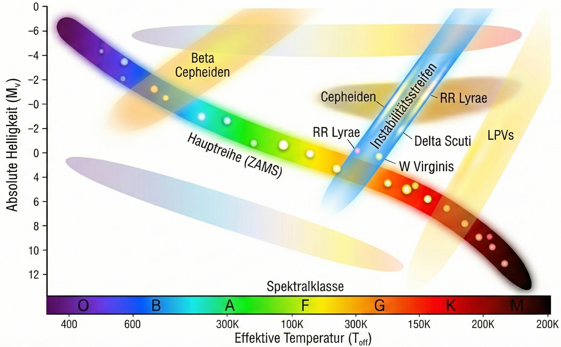 Pulsierende Sterne stehen an besonderen Stellen im Herzsprung Russel Diagramm (HRD). Während viele Riesen und Überriesen am rechten roten Rand des HRD's zu den Langperiodischen Variablen (LPV's) gehören, befindet sich der eigentliche Instabilitä,tsstreifen mitten im Diagramm. Nicht alle Sterne in diesem Bereich zeigen automatisch Pulsationen. Wenn jedoch die richtigen Bedingungen zusammenkommen, kann Pulsation angeregt werden.